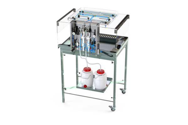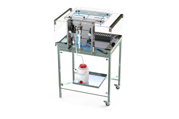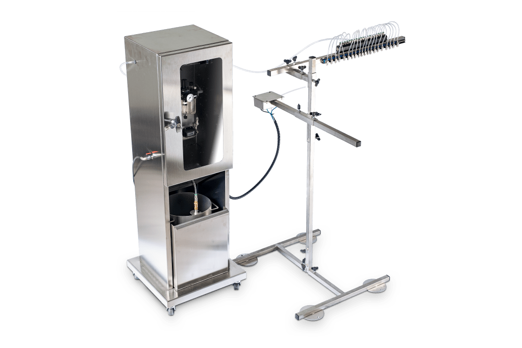 This device ensures a totally independent control of the volume, pressure, and drops size on each circuit. The operation takes place only pneumatically. The perfect mixing required for some live vaccines is ensured by an air bubbler or magnetic stirrer (optional).