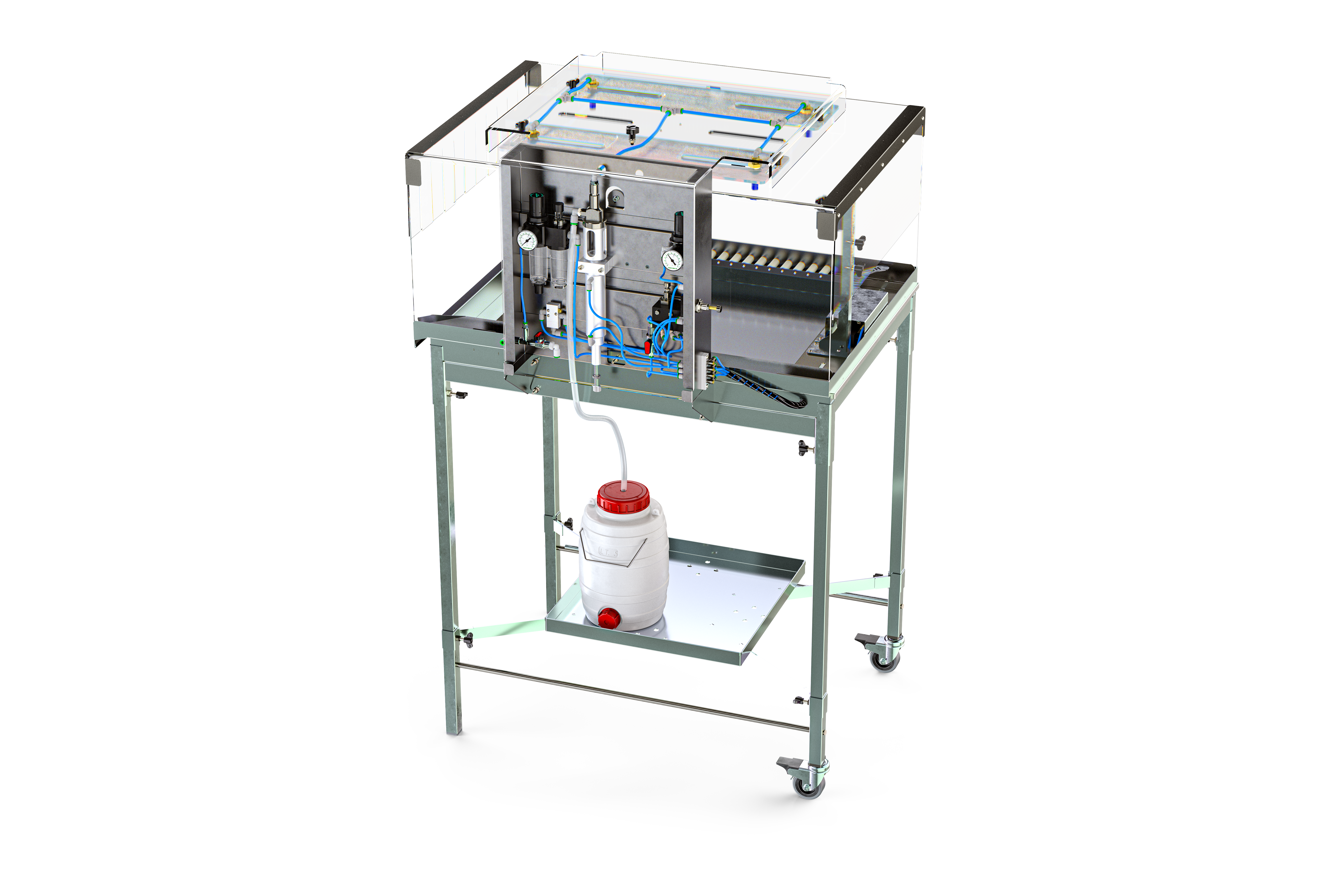 This device ensures a totally independent control of the volume, pressure, and drops size on each circuit. The operation takes place only pneumatically. The perfect mixing required for some live vaccines is ensured by an air bubbler or magnetic stirrer (optional).